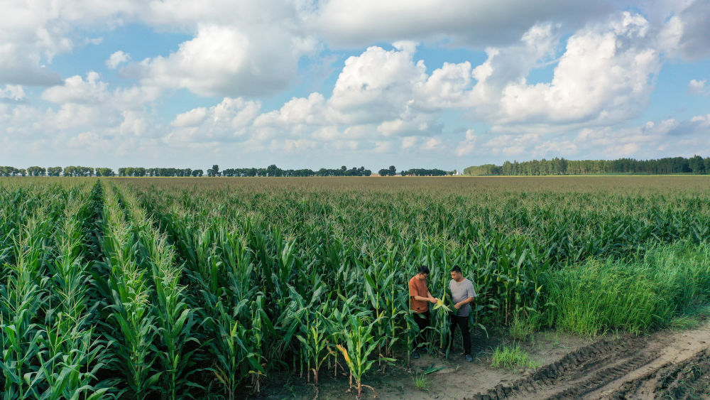 2024年8月8日,在吉林省梨樹縣孤家子鎮(zhèn)兩家子村,當(dāng)?shù)剞r(nóng)業(yè)發(fā)展服務(wù)站高級(jí)農(nóng)藝師蘭雨壯(左)與四平市強(qiáng)盛農(nóng)機(jī)農(nóng)民專業(yè)合作社負(fù)責(zé)人查看玉米長(zhǎng)勢(shì)(無人機(jī)照片)。多年來,地處世界“黃金玉米帶”的全國產(chǎn)糧大縣吉林省梨樹縣,強(qiáng)化科技在農(nóng)業(yè)生產(chǎn)中的支撐作用,持續(xù)提升糧食和重要農(nóng)產(chǎn)品穩(wěn)產(chǎn)保供能力。