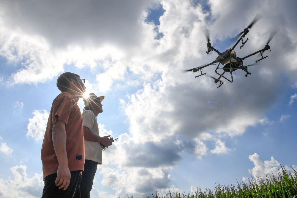2024年8月8日,在吉林省梨樹縣孤家子鎮(zhèn),當(dāng)?shù)剞r(nóng)業(yè)發(fā)展服務(wù)站高級(jí)農(nóng)藝師蘭雨壯(左)查看無人機(jī)作業(yè)情況。