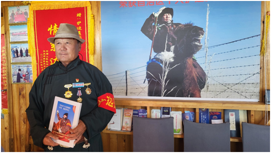 從石頭路走到柏油路,從騎駱駝、馬兒巡邊,到騎摩托車巡邊……圖門的護邊之路走了許多年,他把父輩們守邊護邊的精神一直傳承下去,他說:“作為一名共產黨員,作為一個黨組織信任的‘紅色堡壘戶’,我會守好邊疆安寧,守護好這片綠水青山,服務好家鄉(xiāng)廣大牧民群眾,帶領大家過上幸福生活!”