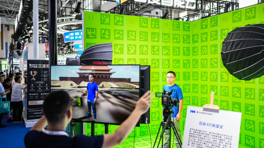 ↑8月28日,參觀者在數(shù)博會展館內(nèi)體驗智能XR演播室。