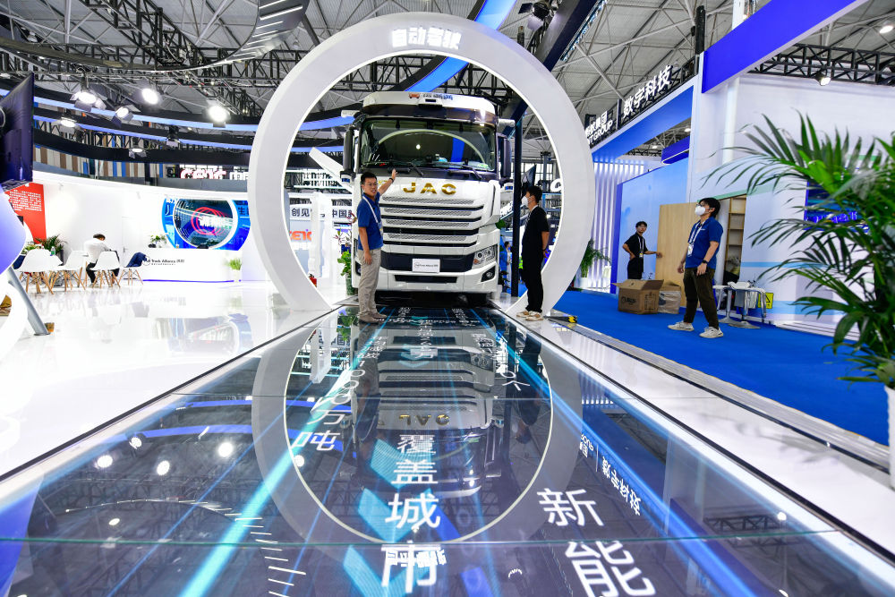 8月28日,工作人員在數(shù)博會上播放無人駕駛重型卡車上路行駛視頻。