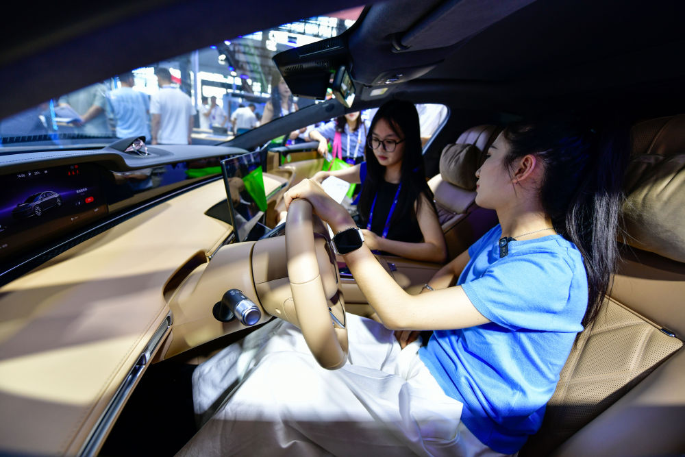 8月28日,參會人員在數(shù)博會上體驗新能源智能駕駛汽車。