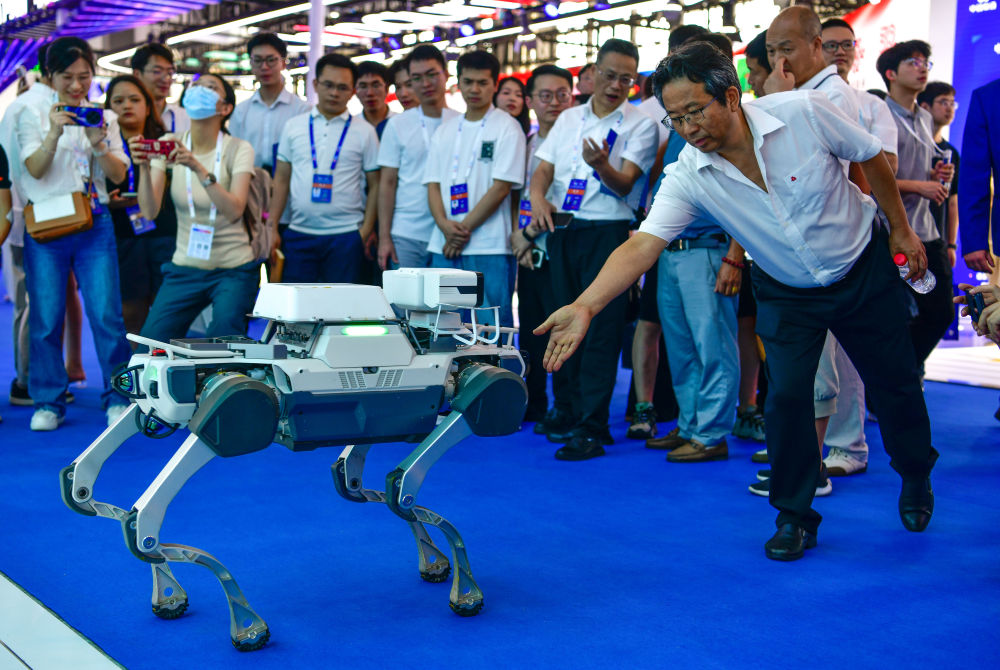 8月28日,參會人員在數(shù)博會上與機器狗互動。