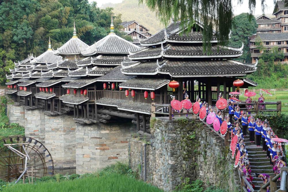侗寨跨水而建。進(jìn)入程陽八寨,首先要走過今年迎來100歲生日的程陽永濟(jì)橋。此橋是樓閣式建筑,整座橋梁搭建時(shí)不用一釘一鉚,主要由木料和石料建成,橋長近80米,寬近4米,高近12米,是我國建筑藝術(shù)中的珍品。