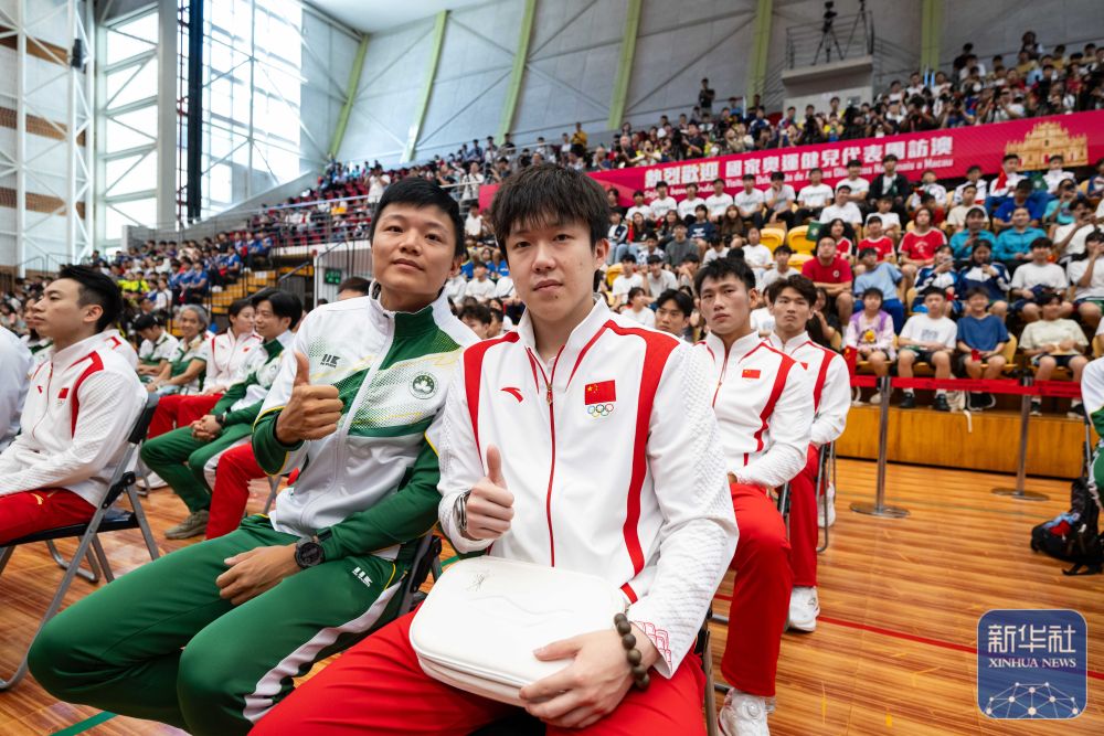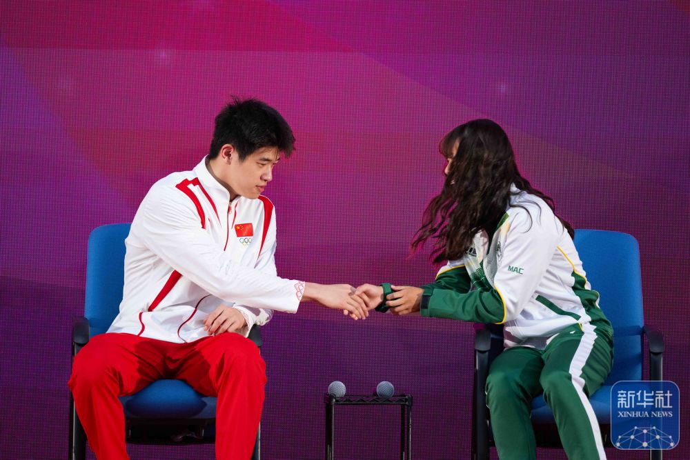 ↑9月1日,游泳運(yùn)動(dòng)員潘展樂(lè)(左)在活動(dòng)中與澳門運(yùn)動(dòng)員握手交流。