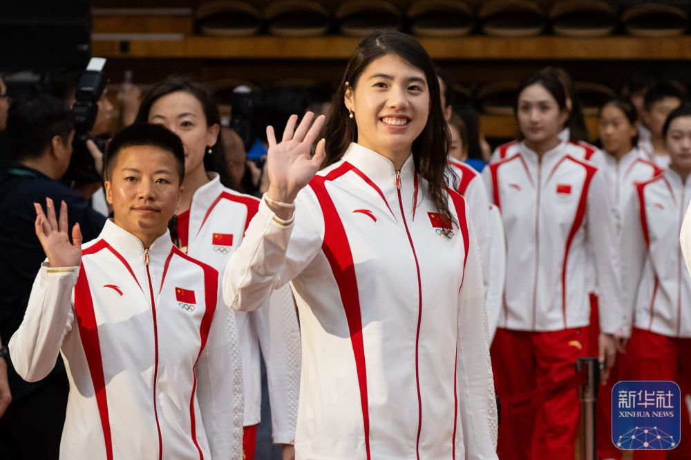 ↑9月1日,游泳運(yùn)動(dòng)員張雨霏(前右)在活動(dòng)中揮手致意。