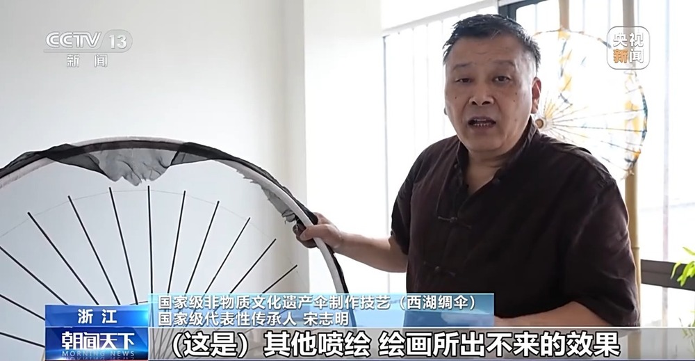 國家級非物質(zhì)文化遺產(chǎn)傘制作技藝(西湖綢傘)國家級代表性傳承人 宋志明:絲綢是夾在中間的,我們的傘面是夾在中間,所以說收攏你是看不到傘面的,這個是獨一無二的。