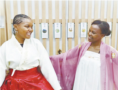 當?shù)貢r間4月20日,為慶祝第十五個聯(lián)合國中文日,南非德班理工大學孔子學院舉辦以“說文解字,以茶會友”為主題的活動?;顒訁⑴c者身穿中國傳統(tǒng)服飾,共同探討漢字和茶文化。圖為兩名當?shù)嘏⒃嚧┲袊鴤鹘y(tǒng)服飾。
