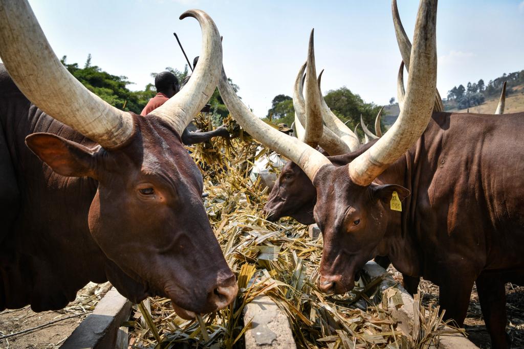 8月14日,在盧旺達(dá)南方省的一處牧場,牲畜食用菌草飼料。