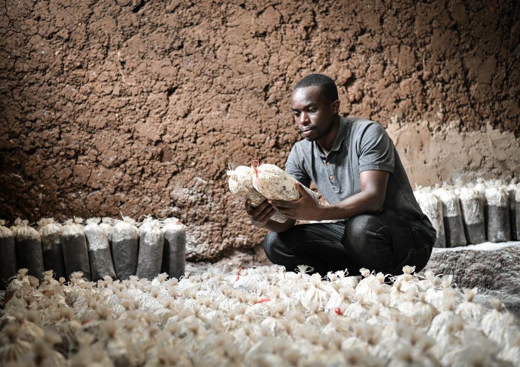 8月14日,在盧旺達(dá)南方省穆漢加區(qū),尼揚(yáng)博·奧貝德在食用菌培育工坊內(nèi)檢查菌袋。曾兩次赴中國進(jìn)行菌草技術(shù)培訓(xùn)的尼揚(yáng)博·奧貝德在南方省和東方省各擁有一家工坊。