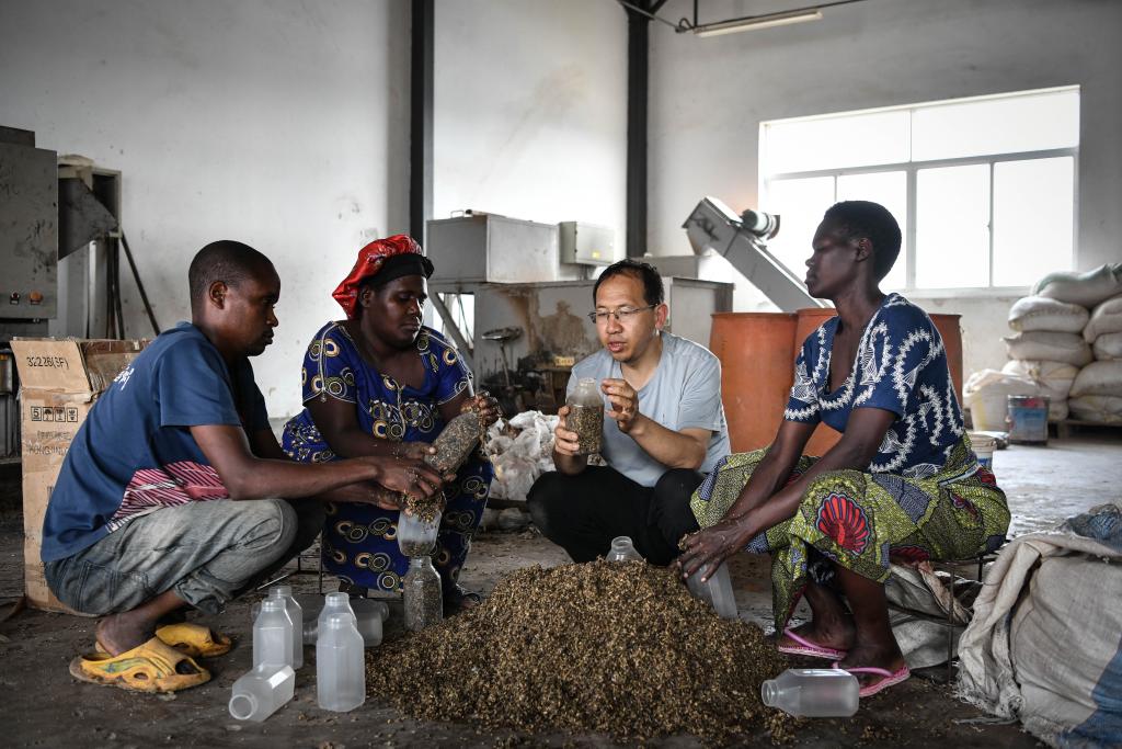 8月13日,在盧旺達(dá)南方省胡耶區(qū)的中國援盧農(nóng)業(yè)技術(shù)示范中心,菌草專家陳曉斌(右二)與當(dāng)?shù)剞r(nóng)民一起制作菌種培養(yǎng)料。