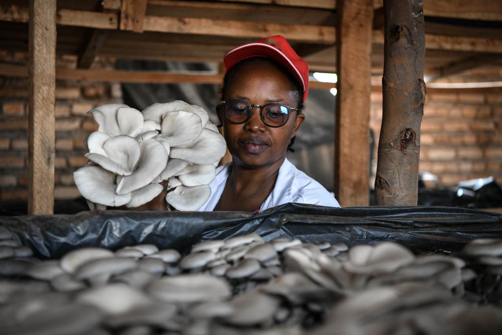 8月15日,在盧旺達(dá)首都基加利,蘇珊娜·尼庫澤在自己的菇棚內(nèi)采摘鮮菇。