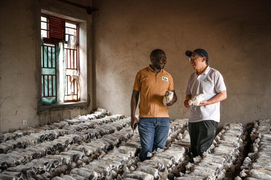 8月14日,在盧旺達(dá)南方省尼安薩區(qū)的一家食用菌培育工坊,菌草專家陳曉斌與工坊主人卡納尼·埃納尼交流。
