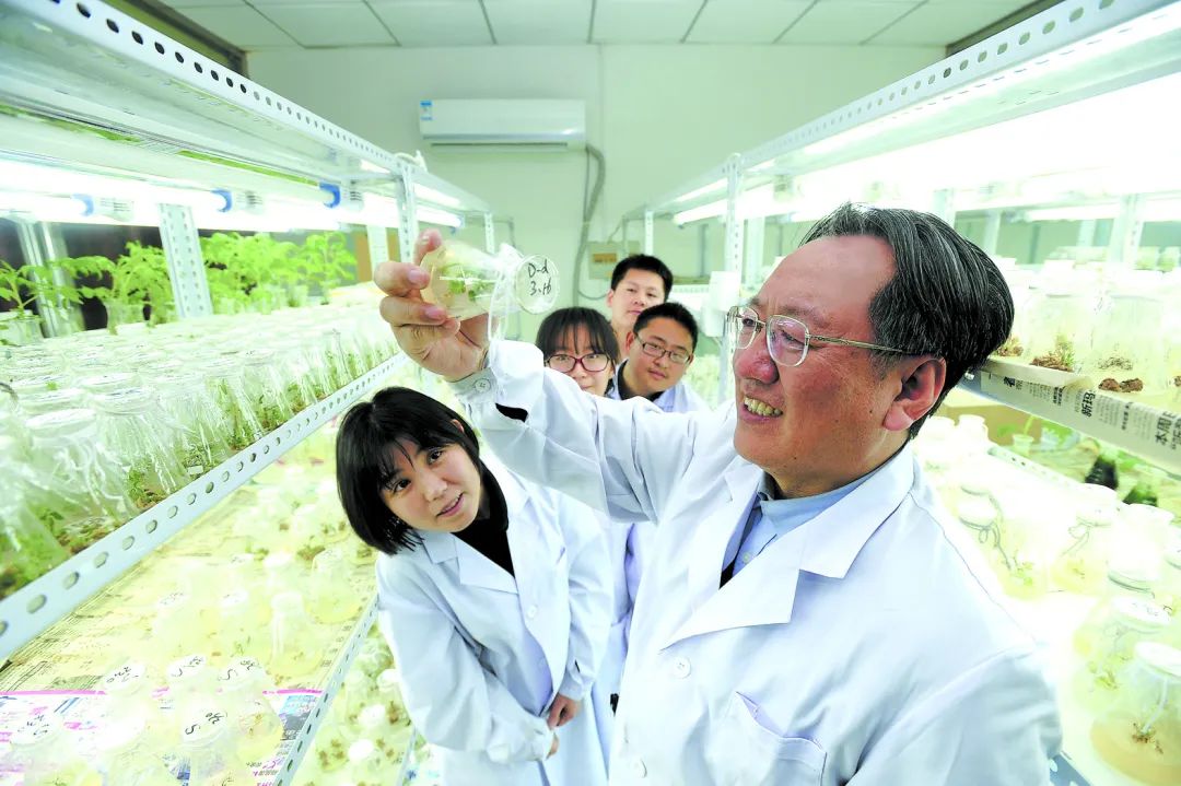 沈陽農(nóng)業(yè)大學(xué)教授李天來院士在實(shí)驗(yàn)室指導(dǎo)研究生開展科研,觀察番茄遺傳轉(zhuǎn)化過程等情況。