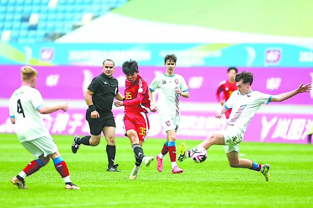 2024年國際中學(xué)生體育聯(lián)合會(huì)足球世界杯在遼寧省大連市舉行,中外球員角逐綠茵場。 遼寧省教育廳供圖