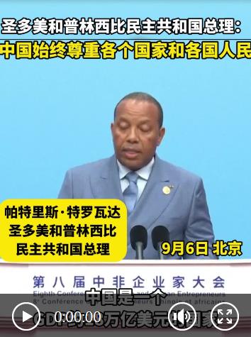 圣多美和普林西比民主共和國總理帕特里斯·特羅瓦達6日在第八屆中非企業(yè)家大會開幕式上說,中國是個大國,而圣多美和普林西比人口只有23萬?!拔医裉煊袡C會在這里發(fā)言,體現(xiàn)了中國始終尊重各個國家和各國人民,共建、共享繁榮和平世界,共筑中非命運共同體。”