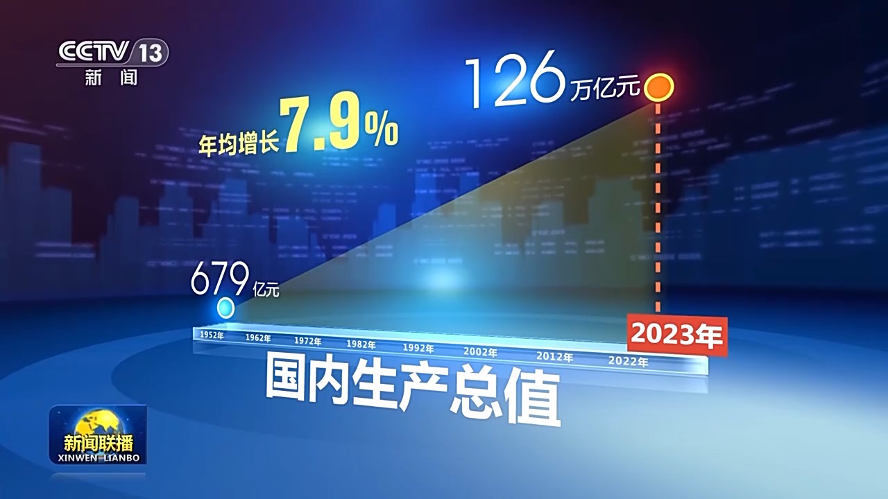 我國(guó)國(guó)內(nèi)生產(chǎn)總值,從有數(shù)據(jù)統(tǒng)計(jì)以來(lái)的1952年的679億元,增長(zhǎng)到2023年的126萬(wàn)億元,年均增長(zhǎng)7.9%。