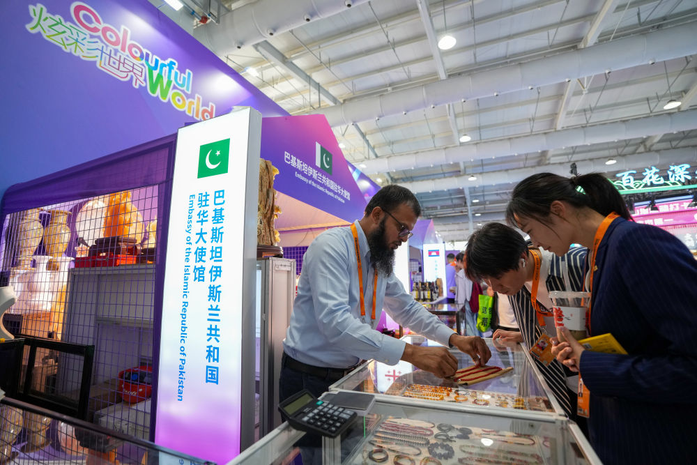 9月12日,在服貿(mào)會(huì)首鋼園區(qū)的炫彩世界——‘一帶一路’沿線(xiàn)國(guó)家特色文化展示活動(dòng)上,參觀者在巴基斯坦伊斯蘭共和國(guó)駐華大使館展區(qū)選購(gòu)商品。新華社記者 鞠煥宗 攝