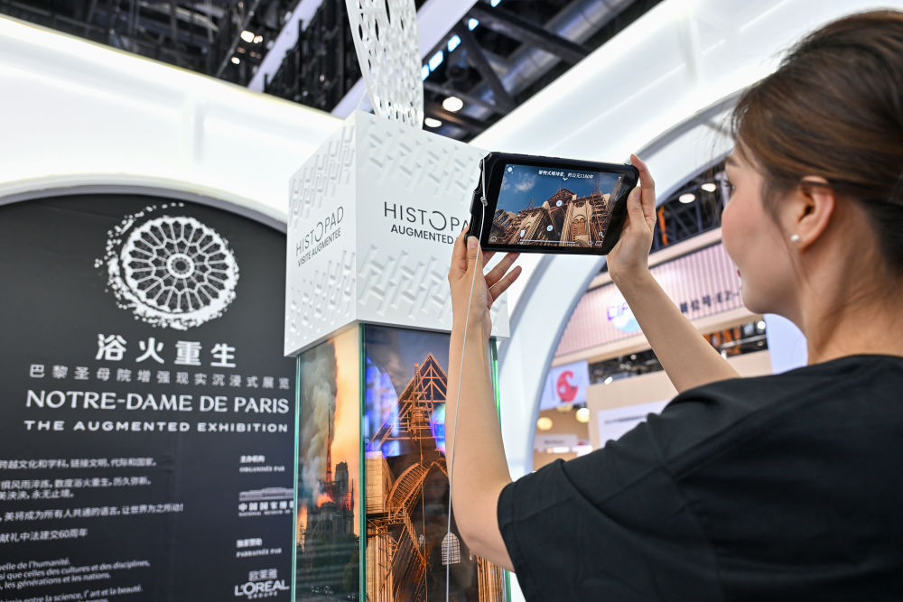 9月12日,法國(guó)國(guó)家館工作人員介紹“巴黎圣母院增強(qiáng)現(xiàn)實(shí)沉浸式展覽”。 新華社記者 李鑫 攝