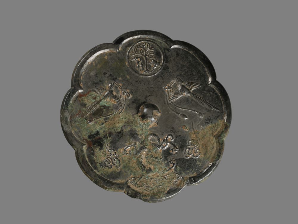 這枚雙鸞月宮紋葵花形鏡為國家二級文物,直徑15.3厘米,重0.54千克,1983年出土于陜西省東南部地區(qū)。陜西歷史博物館社會教育部主任、研究館員呼嘯說:“這枚銅鏡不過手掌大小,其畫面卻紋飾細膩、層次豐富?!?/p>