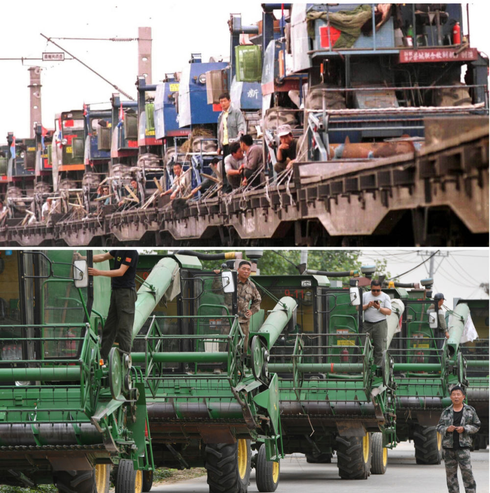 拼版照片:上圖為1999年,滿載著參加跨區(qū)收割小麥作業(yè)收割機的專列從石家莊鐵路分局正定火車站開出,將河北深州、藁城等地農(nóng)民的120多臺收割機運往河南開封(新華社記者 周文廣 攝);下圖為2020年6月2日,在河南周口黃泛區(qū)農(nóng)場九分場,農(nóng)機隊伍準(zhǔn)備出發(fā)(新華社記者 李嘉南 攝)。
