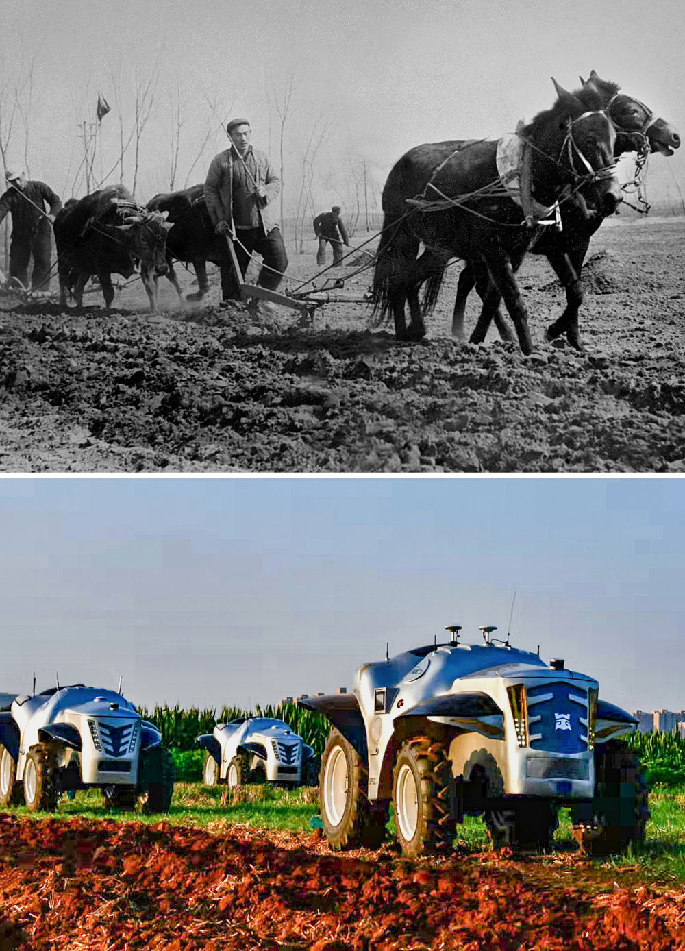拼版照片:上圖為1954年,河南開封農(nóng)民在用傳統(tǒng)的畜拉步犁耕地(呂學(xué)召 攝);下圖為2019年7月26日,洛陽一拖集團生產(chǎn)的純電動無人駕駛拖拉機準(zhǔn)備做耕地測試(潘郁 攝)。