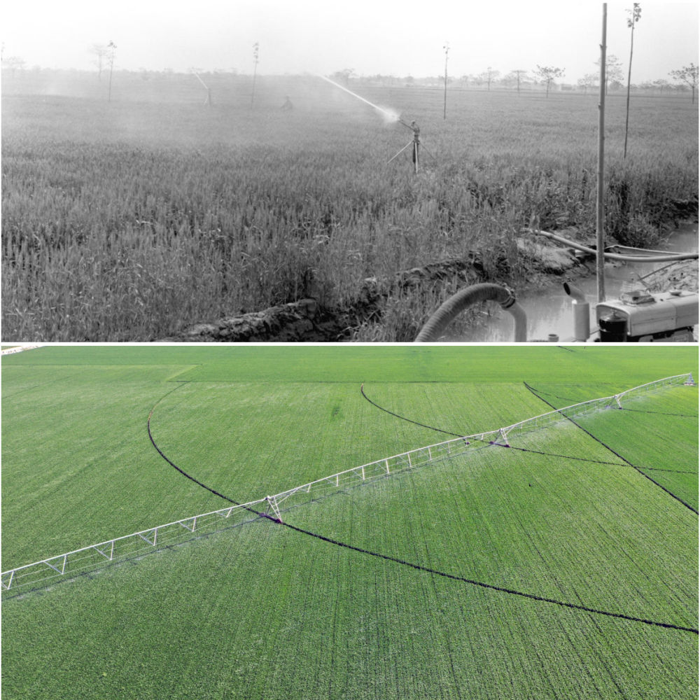 拼版照片:左圖為20世紀(jì)50年代,河南郾城萬金公社社員在踩水車澆田(魏德忠 攝);右圖為2017年3月9日,在河南浚縣王莊鎮(zhèn)一處麥田里,自走式智能噴灌機在進行噴灌作業(yè)(新華社記者 李安 攝)。