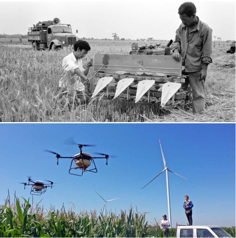 拼版照片:上圖為1986年,河南浚縣農(nóng)機公司組織服務(wù)隊走村串鄉(xiāng)義務(wù)修理農(nóng)業(yè)機械(新華社記者 唐茂林 攝);下圖為2020年9月4日,河南湯陰“精忠飛防大隊”飛手在操作植保無人機(新華社記者 李嘉南 攝)。