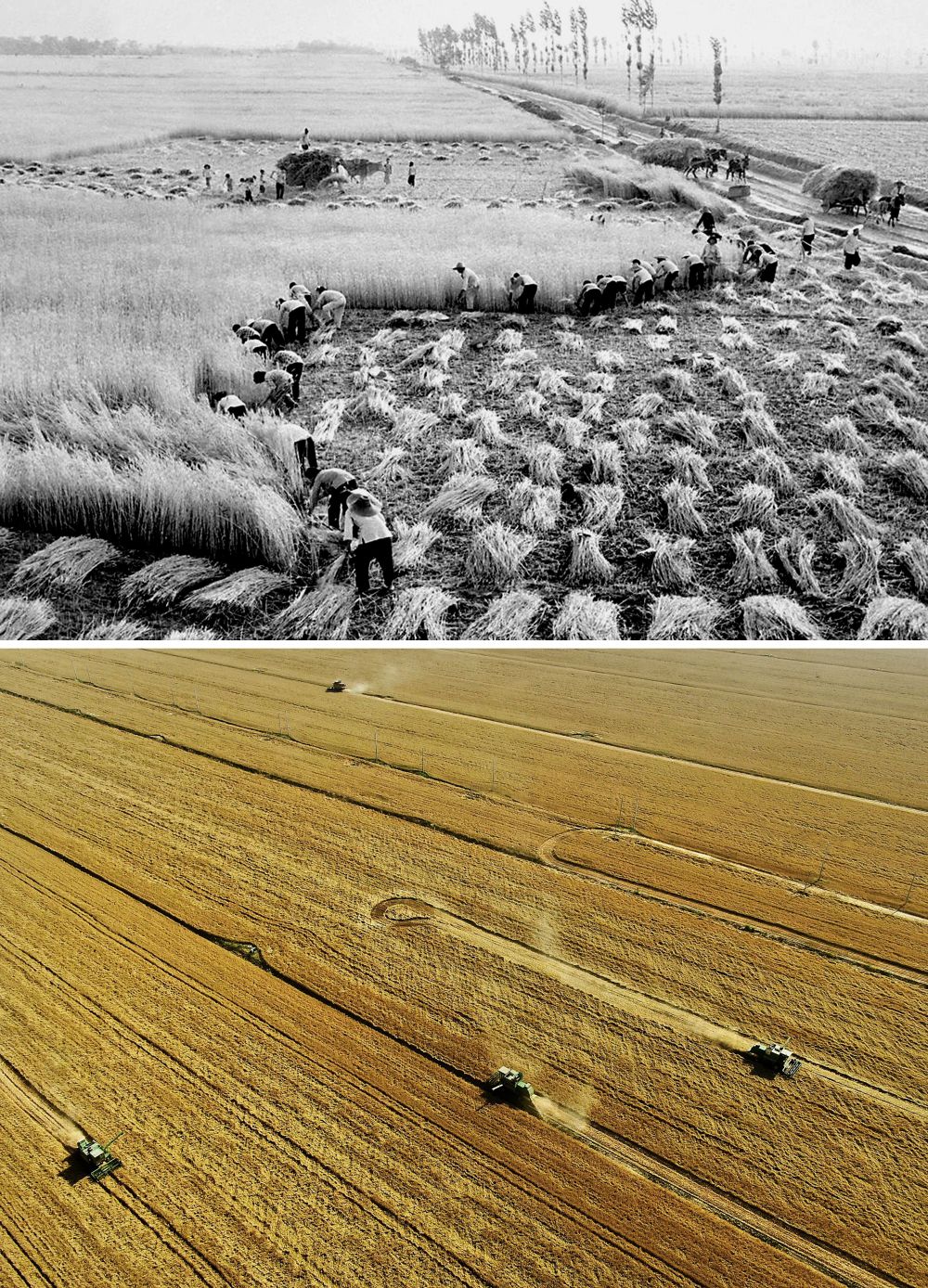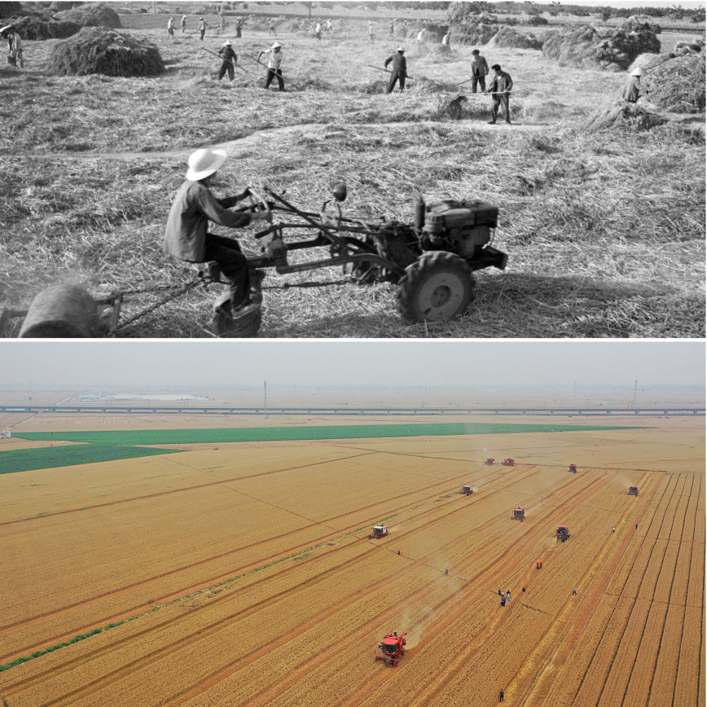 拼版照片:上圖為20世紀(jì)50年代,河南偃師萬畝豐產(chǎn)區(qū)開鐮收割小麥(新華社記者 唐茂林 攝);下圖為2021年6月6日,在河南周口黃泛區(qū)農(nóng)場九分場的麥田里,農(nóng)機手操作收割機收獲小麥(新華社記者 李安 攝)。
