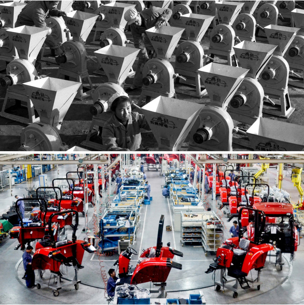 拼版照片:上圖為1971年,河南禹縣(現(xiàn)禹州市)生產(chǎn)的大批粉碎機準(zhǔn)備運送出廠(蔡玉琦 攝);下圖為2012年9月12日拍攝的河南洛陽一拖集團東方紅拖拉機生產(chǎn)線(新華社發(fā))。