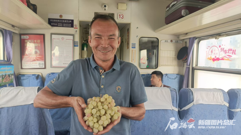 車廂內(nèi)頓時一片歡騰,“石榴姐妹”“無花果大哥”“核桃兄弟”紛紛打開袋子和紙箱,請旅客們挑選。