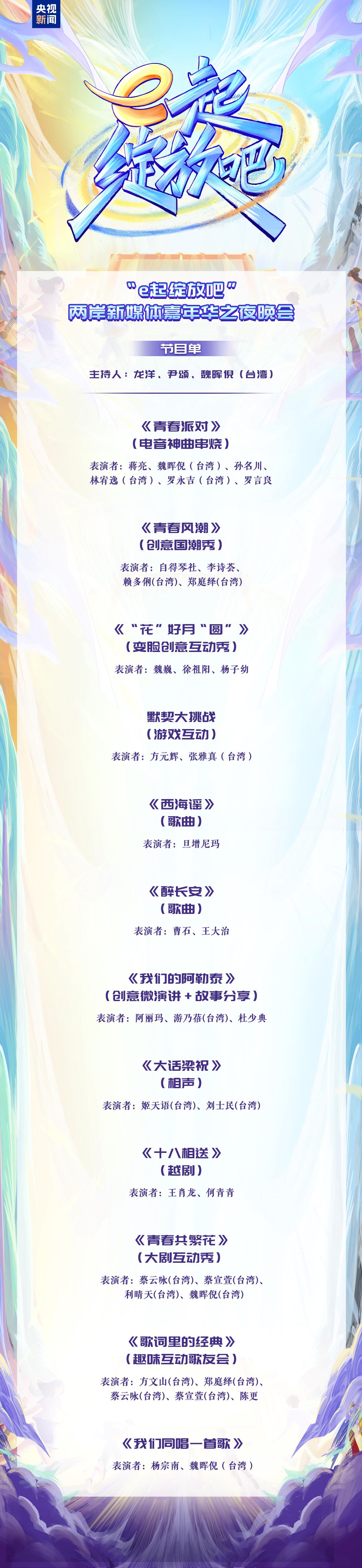 “e起綻放吧”兩岸新媒體嘉年華之夜晚會今晚(9月25日)20時將在看臺海、大灣區(qū)之聲、央視頻、央視新聞、央視財(cái)經(jīng)等平臺播出。來自兩岸的文化名人、網(wǎng)紅博主、青年代表以“才藝+故事”的融合表現(xiàn)形式,結(jié)合影視劇、國潮音樂、舞蹈、詩詞歌賦、旅游美食等文化元素,共尋文化記憶、共話青春故事、共融民族情感,共享一場心手相牽的青春盛宴。兩岸年輕人在晚會中同唱一首歌、同追一部劇、同創(chuàng)一首詩,展現(xiàn)兩岸交流交往、融合發(fā)展中的蓬勃青春力量。