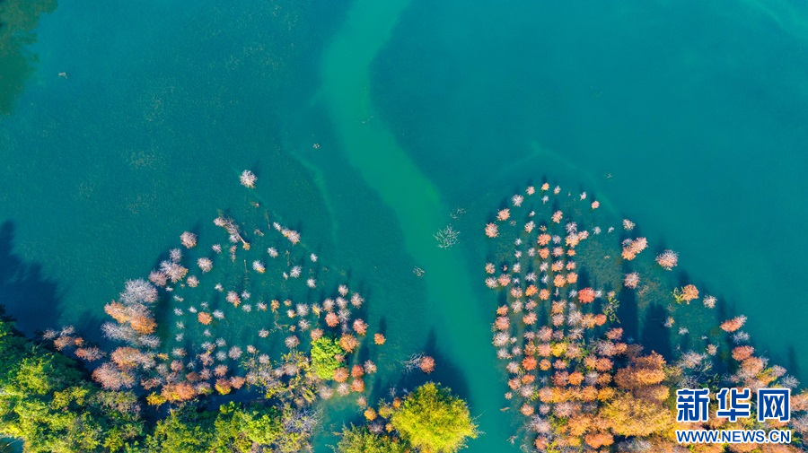 航拍廣東中山落羽杉與藍(lán)天碧水相映成趣。新華網(wǎng)發(fā)(黃健斌 攝)