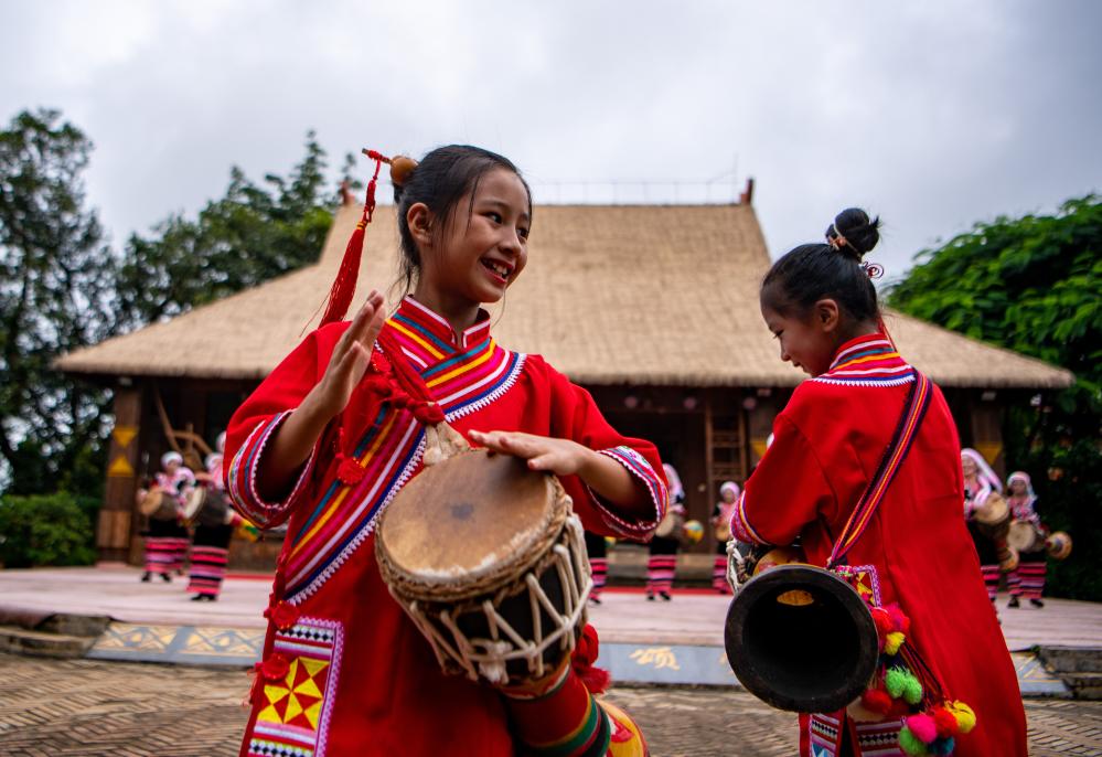 2022年7月6日,云南瀾滄拉祜族自治縣班利村的小演員為游客表演。新華社記者江文耀 攝