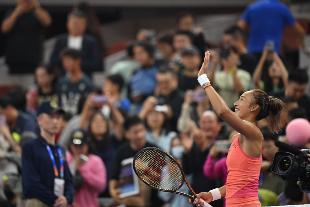 9月28日,鄭欽文在賽后向觀眾致意。當(dāng)日,在北京進行的2024中國網(wǎng)球公開賽女單第二輪比賽中,中國選手鄭欽文2:0戰(zhàn)勝俄羅斯選手拉希莫娃,晉級下一輪。新華社記者 張龍 攝