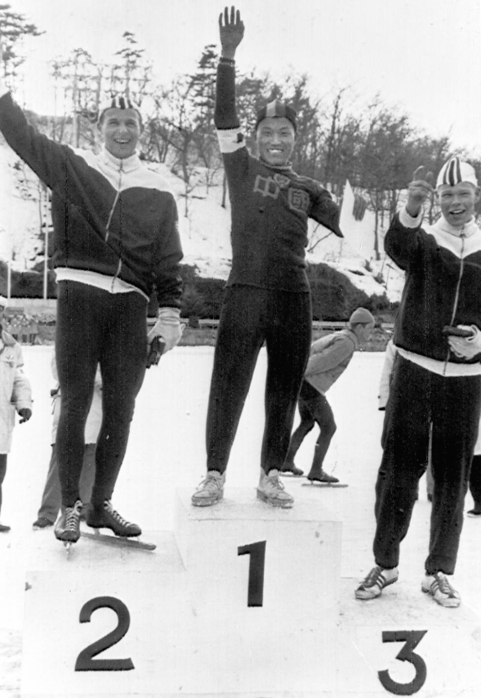 1963年2月24日,在日本舉行的世界速度滑冰錦標(biāo)賽中,羅致煥獲得男子1500米項目冠軍。這是中國運動員第一次取得冰雪項目的單項世界冠軍。圖為羅致煥(中)受獎后向觀眾致意。 新華社發(fā)(資料照片)