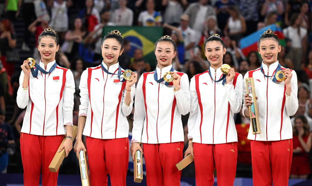 8月10日,中國隊在頒獎儀式上。當(dāng)日,在巴黎奧運會藝術(shù)體操項目集體全能決賽中,中國隊獲得冠軍。新華社記者 程敏 攝