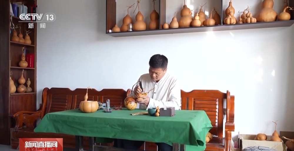 在伊車嘎善錫伯族鄉(xiāng)加爾蘇村,48歲的曹光耀潛心創(chuàng)作葫蘆烙畫已經(jīng)有10年,自幼喜歡畫畫的他,將電烙鐵變成靈活的畫筆,在葫蘆上勾勒出一幅幅動人的新疆百景圖。