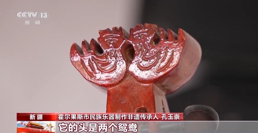 霍爾果斯市民族樂器制作非遺傳承人 孔玉崇:鴛鴦是很美好的,它有兩個腹板,也可以互為背板。它的頭是兩個鴛鴦,在一個腿上可以彈,坐著也可以拉,很方便。你帶著這么一把琴就等于帶了兩把琴,因為它拉的也有,彈的也有。