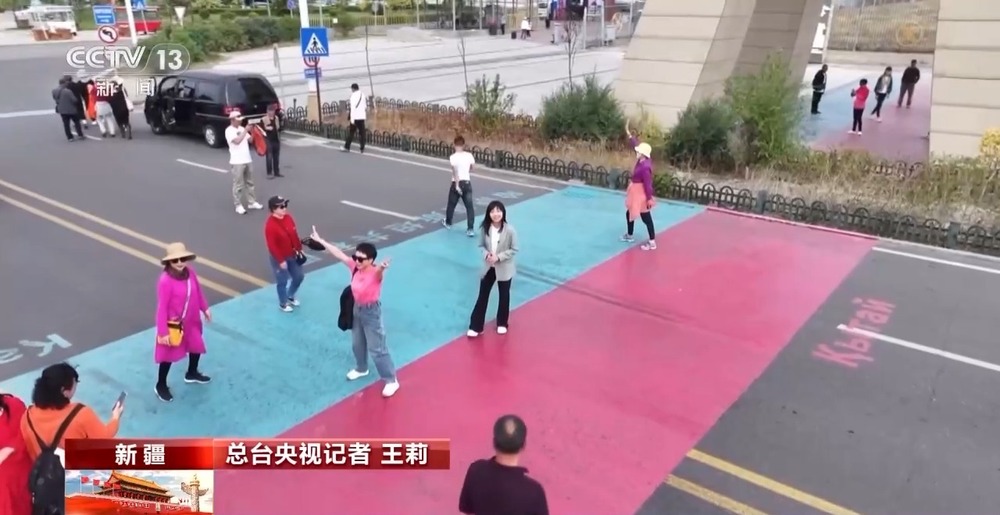 總臺央視記者 王莉:進入合作中心,中哈連接通道處的“一步跨兩國”,絕對是游客的打卡首選地。紅色和藍色交界的地方,就是國界線了,線的一側(cè)紅色區(qū)域代表中國,藍色區(qū)域代表哈薩克斯坦。前一秒還在中國,只要一腳邁過分界線,就能一秒“出國”,來到哈薩克斯坦。