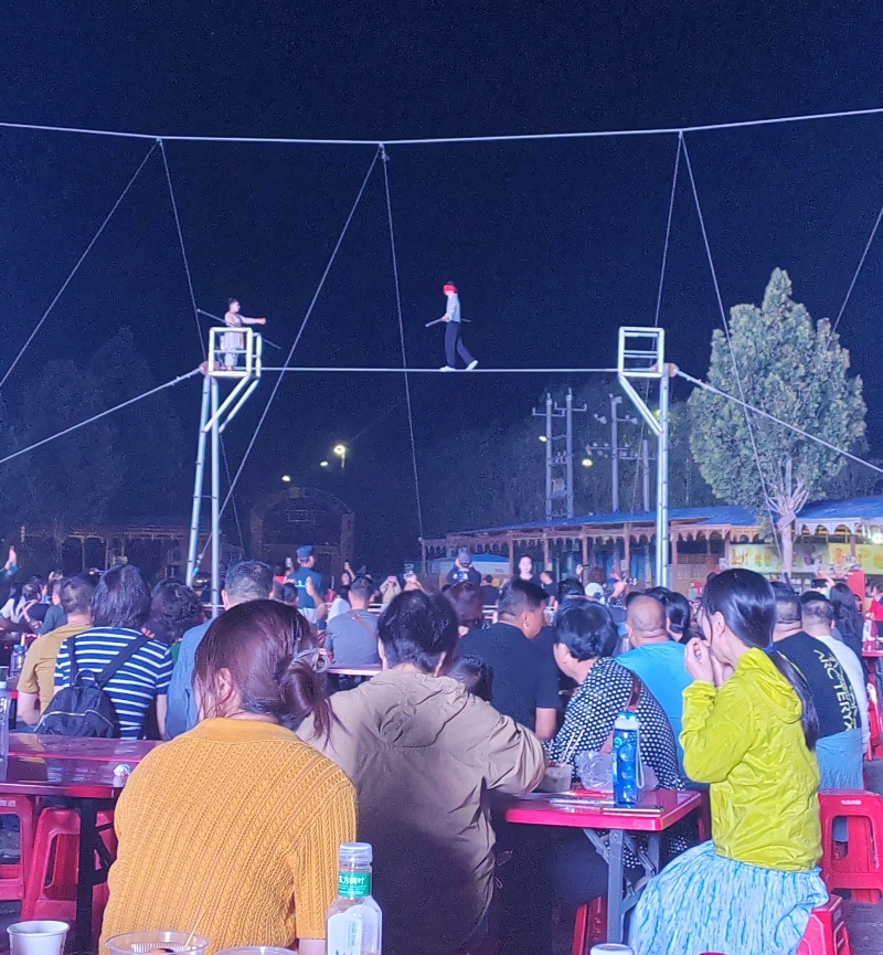 夜幕降臨,華燈初上,阿克蘇老街夜市美食與文化的融合相得益彰。特色烤包子、烤全羊、抓飯、肚包肉等美食的香氣與攤主的叫賣聲交織在一起;民族樂(lè)器、木盤、木碗、木勺等非遺產(chǎn)品,既有滄桑感,更有文化味;達(dá)瓦孜表演中,兩名演員在手持平衡桿,在高空繩索上表演前后走動(dòng)、盤腿端坐、蒙眼行走、飛身跳躍等一系列驚心動(dòng)魄的技藝,引得觀眾拍手稱絕;賽乃姆、龜茲樂(lè)舞等讓人們感受到了中華文化的魅力和深厚底蘊(yùn)。