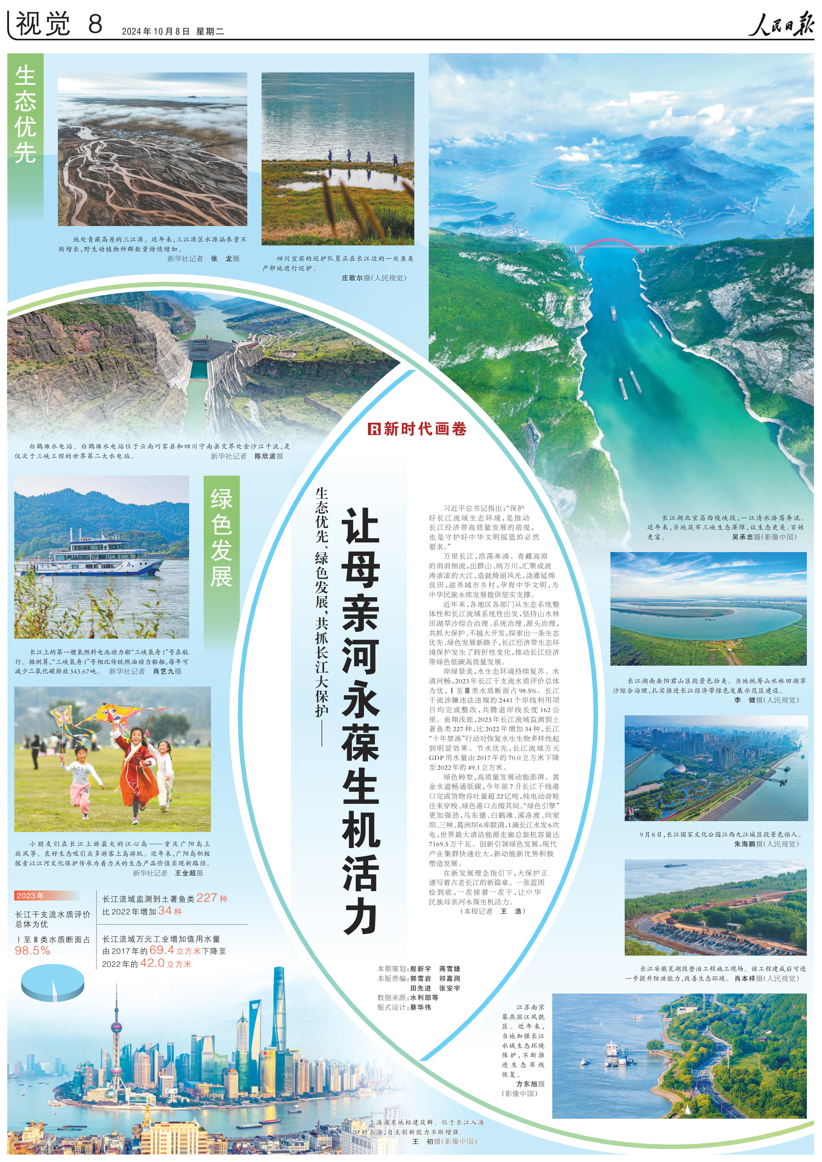 岸綠景美,水生態(tài)環(huán)境持續(xù)復蘇。水清河暢,2023年長江干支流水質評價總體為優(yōu),Ⅰ至Ⅲ類水質斷面占98.5%。長江干流涉嫌違法違規(guī)的2441個岸線利用項目均完成整改,共騰退岸線長度162公里。魚翔淺底,2023年長江流域監(jiān)測到土著魚類227種,比2022年增加34種,長江“十年禁漁”行動對恢復水生生物多樣性起到明顯效果。節(jié)水優(yōu)先,長江流域萬元GDP用水量由2017年的70.0立方米下降至2022年的49.1立方米。
