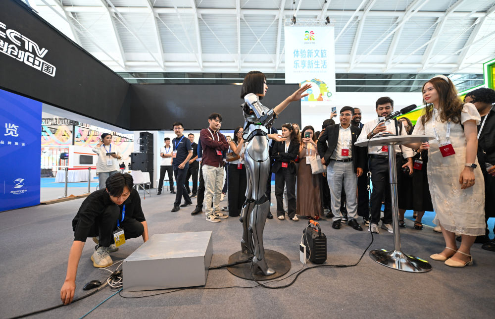會展搭建師在天津舉辦的中國文化旅游產(chǎn)業(yè)博覽會現(xiàn)場維護(hù)AI機器人互動設(shè)備(9月13日攝)。新華社記者 孫凡越 攝