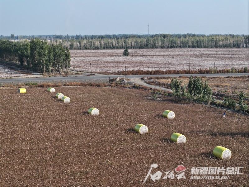 10月10日,沙灣市大泉鄉(xiāng)燒坊莊子村的萬畝棉田,一個(gè)個(gè)打包好的“金蛋蛋”散落在田間。孫志坤 攝