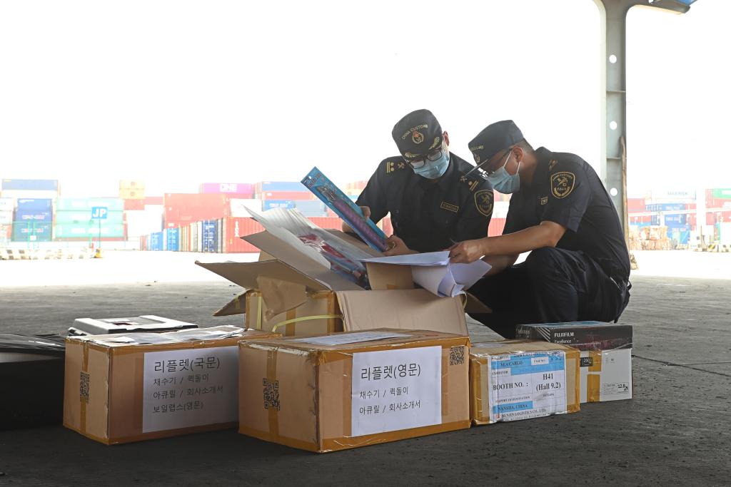 廣州海關(guān)所屬南沙海關(guān)關(guān)員對(duì)第136屆廣交會(huì)進(jìn)口展品進(jìn)行監(jiān)管。(麥東豪攝)