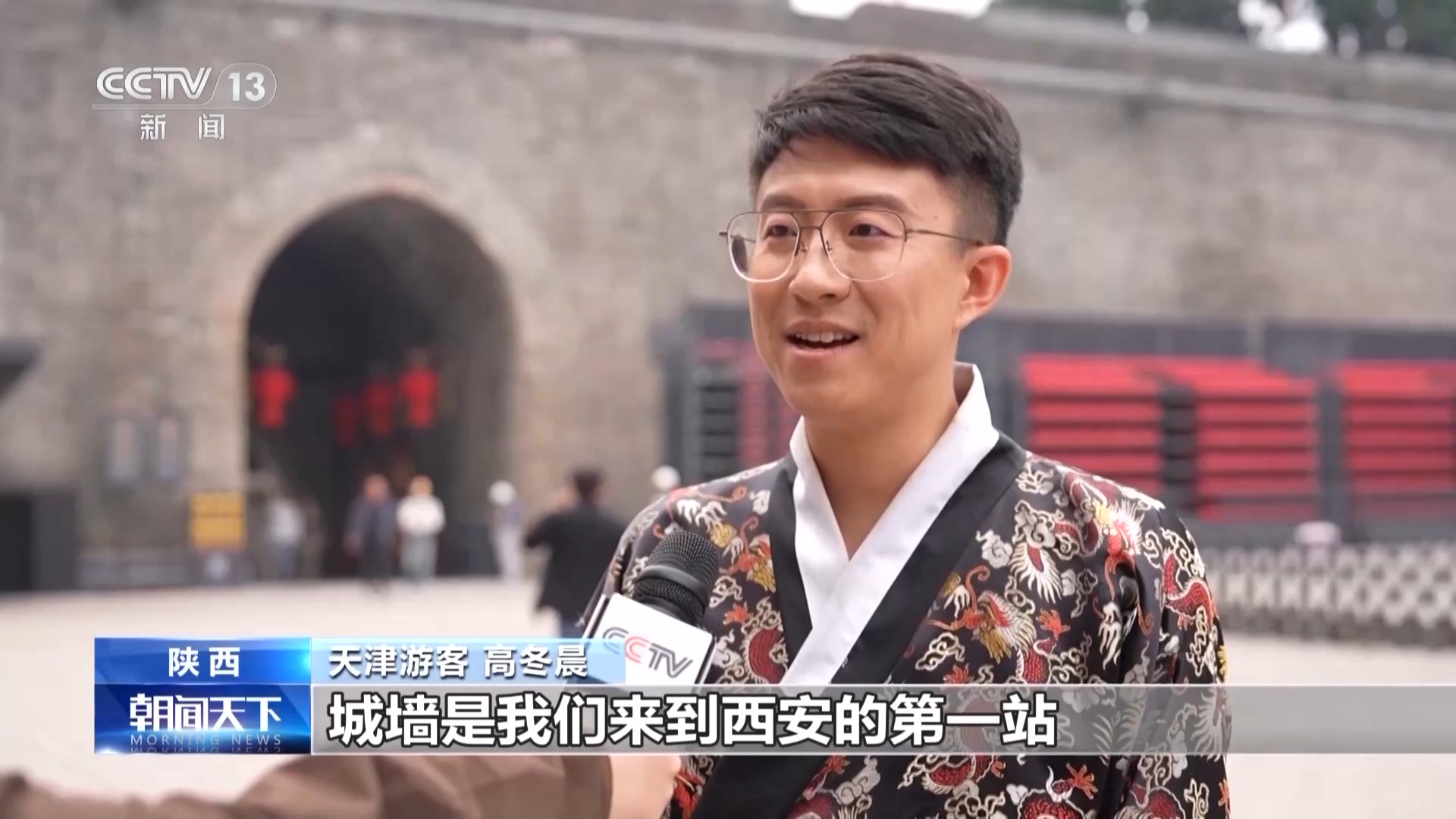 天津游客 高冬晨:城墻是我們來到西安的第一站,來了之后第一個感覺就是這里非常雄偉,非常震撼,而且非常有文化底蘊。
