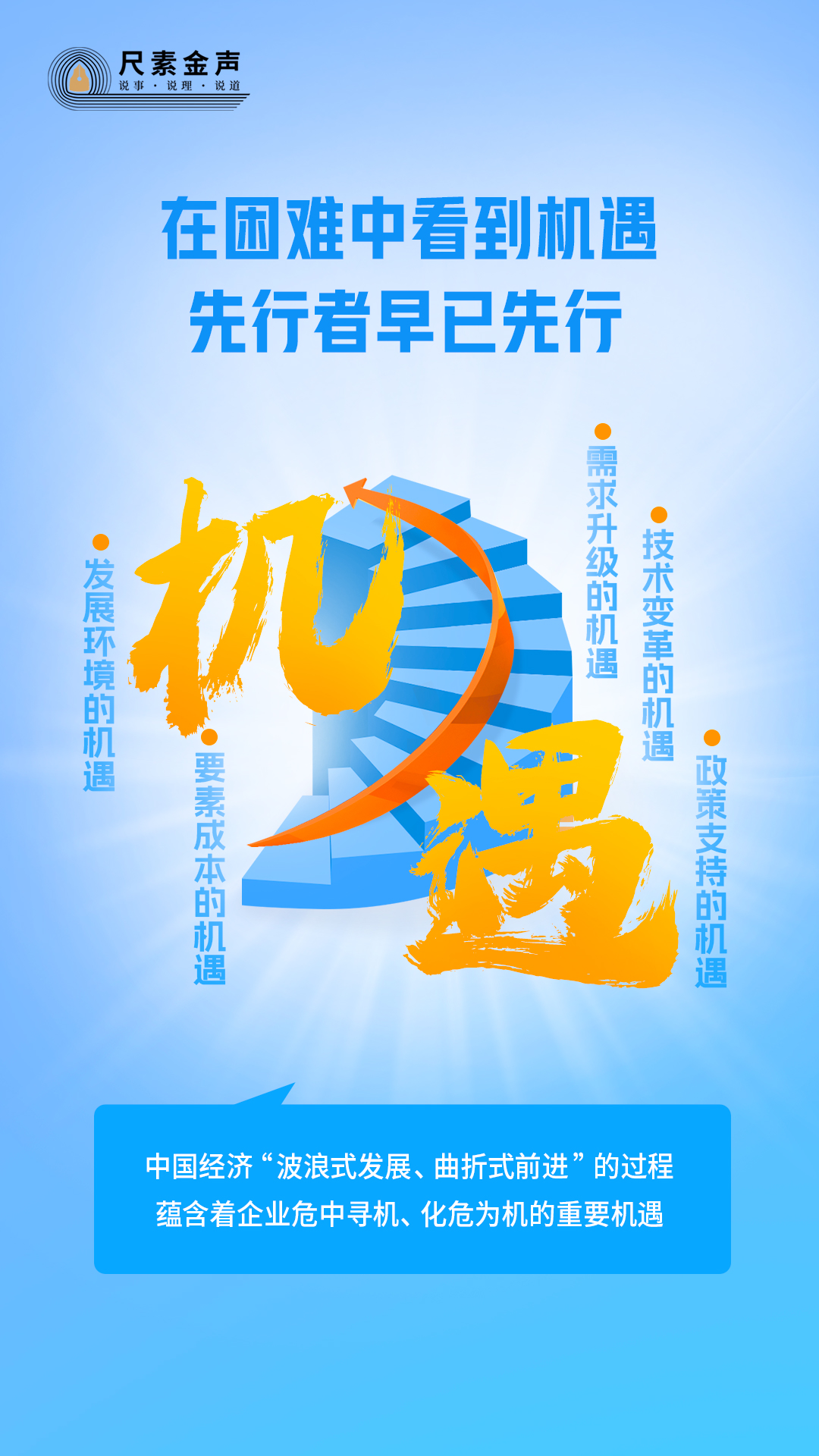 辯證看,應(yīng)對(duì)困難、解決問題的過程,往往也是育新機(jī)、開新局的過程。當(dāng)前,中國(guó)經(jīng)濟(jì)“波浪式發(fā)展、曲折式前進(jìn)”的過程,蘊(yùn)含著企業(yè)危中尋機(jī)、化危為機(jī)的重要機(jī)遇。