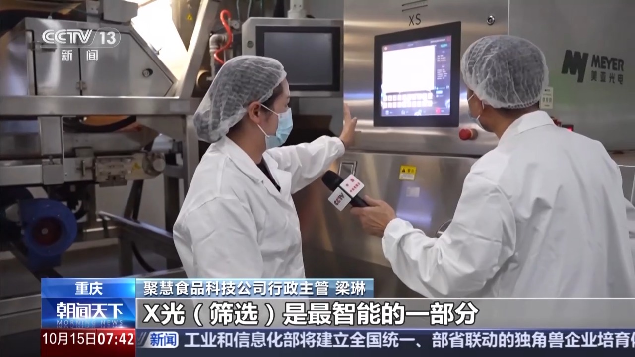 重慶聚慧食品科技公司行政主管 梁琳:X光篩選是最智能的一部分,可以達(dá)到99%的挑選率,后面再通過兩道人工篩選,保證辣椒100%去除異質(zhì),送到生產(chǎn)線。