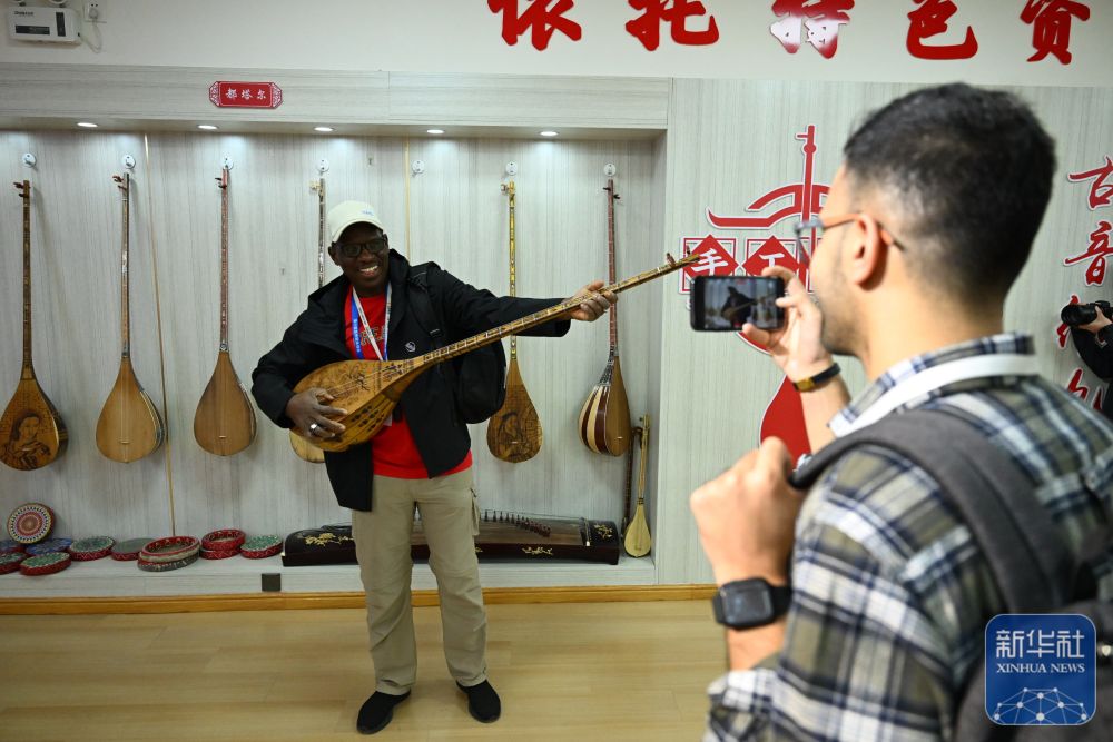 10月15日,與會嘉賓在阿克蘇地區(qū)新和縣加依村加依手工樂器產(chǎn)業(yè)園體驗傳統(tǒng)樂器。