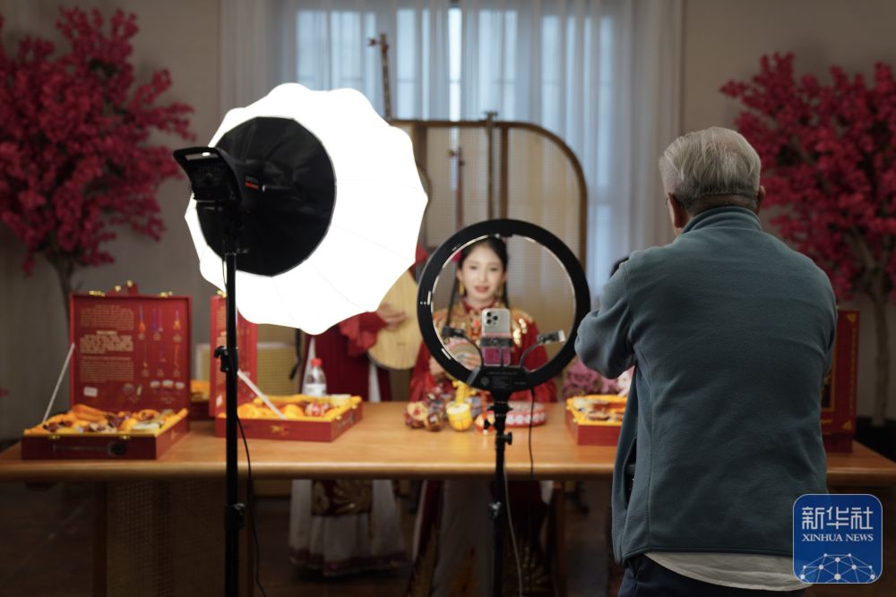 10月15日,與會嘉賓在阿克蘇地區(qū)新和縣加依村龜茲文化樂器展示中心觀看工作人員直播。